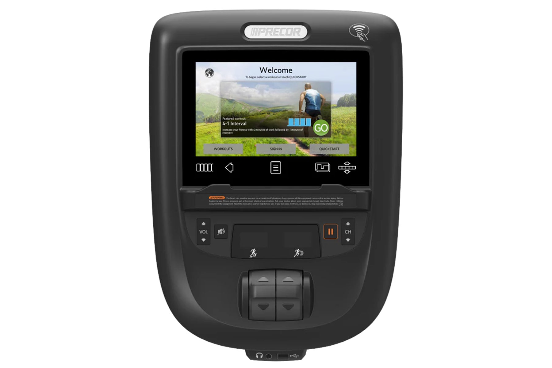 The P62 touchscreen console, available on all models of the Experience™ Series 600, 700, and 800 Lines, strikes the perfect balance if you’re seeking crisp, clear entertainment viewing for your cardio exercisers, but at a value price. When networked, via a wired or wireless connection, you’ll be able to leverage the Precor platform, packed with unique workouts, entertainment, and communication tools.