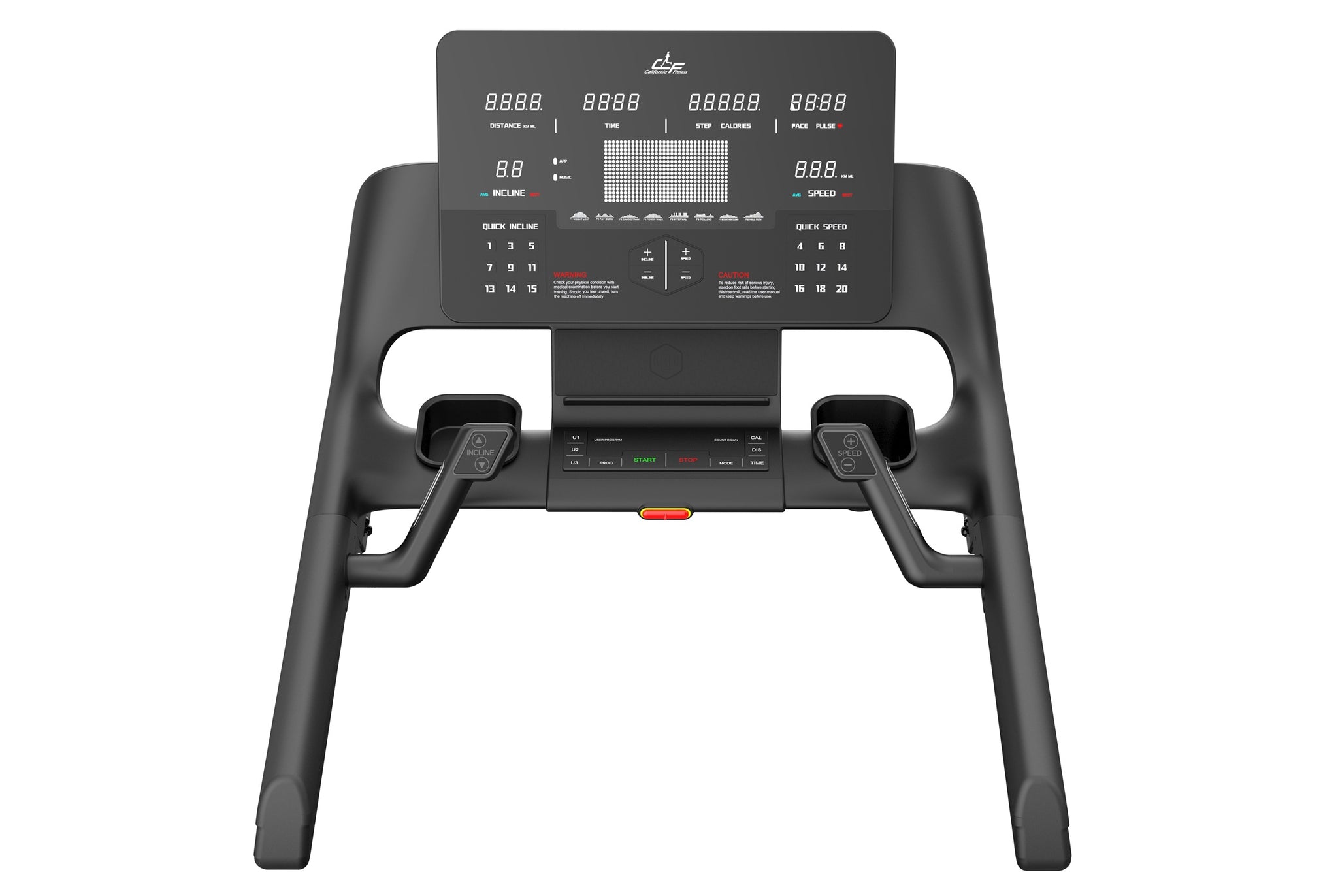 Heart Rate Bars, Quick Start and Reset Buttons, Device Holder, Cup Holders, Emergency Stop, Bluetooth Speakers and more - everything within easy reach with multiple options for changing your workout intensity...all at the tip of you fingers on the California Fitness Malibu 8.5T Treadmill. You won't have break stride or even pause to adjust your performance intensity to the perfect level.