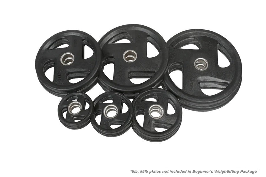 The Warrior Beginner's Weightlifting Package includes: 2 x 10lb / 2 x 25lb / 2 x 35lb / 2 x 45lb = 230lb Rubber Grip Olympic Weight Plate Set.