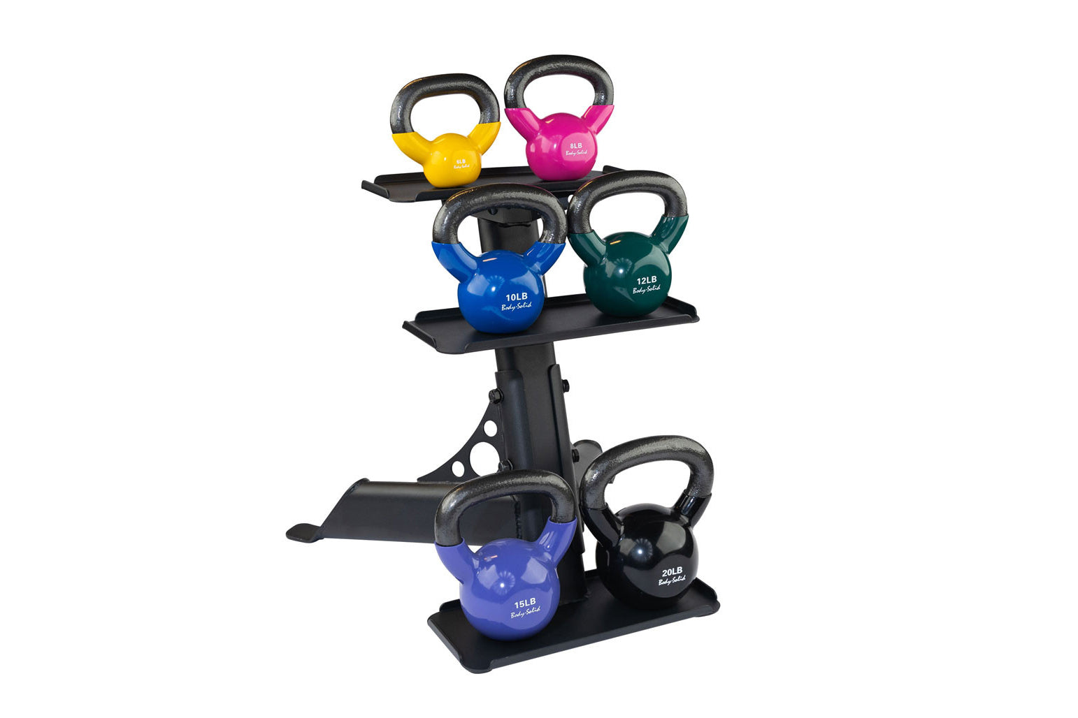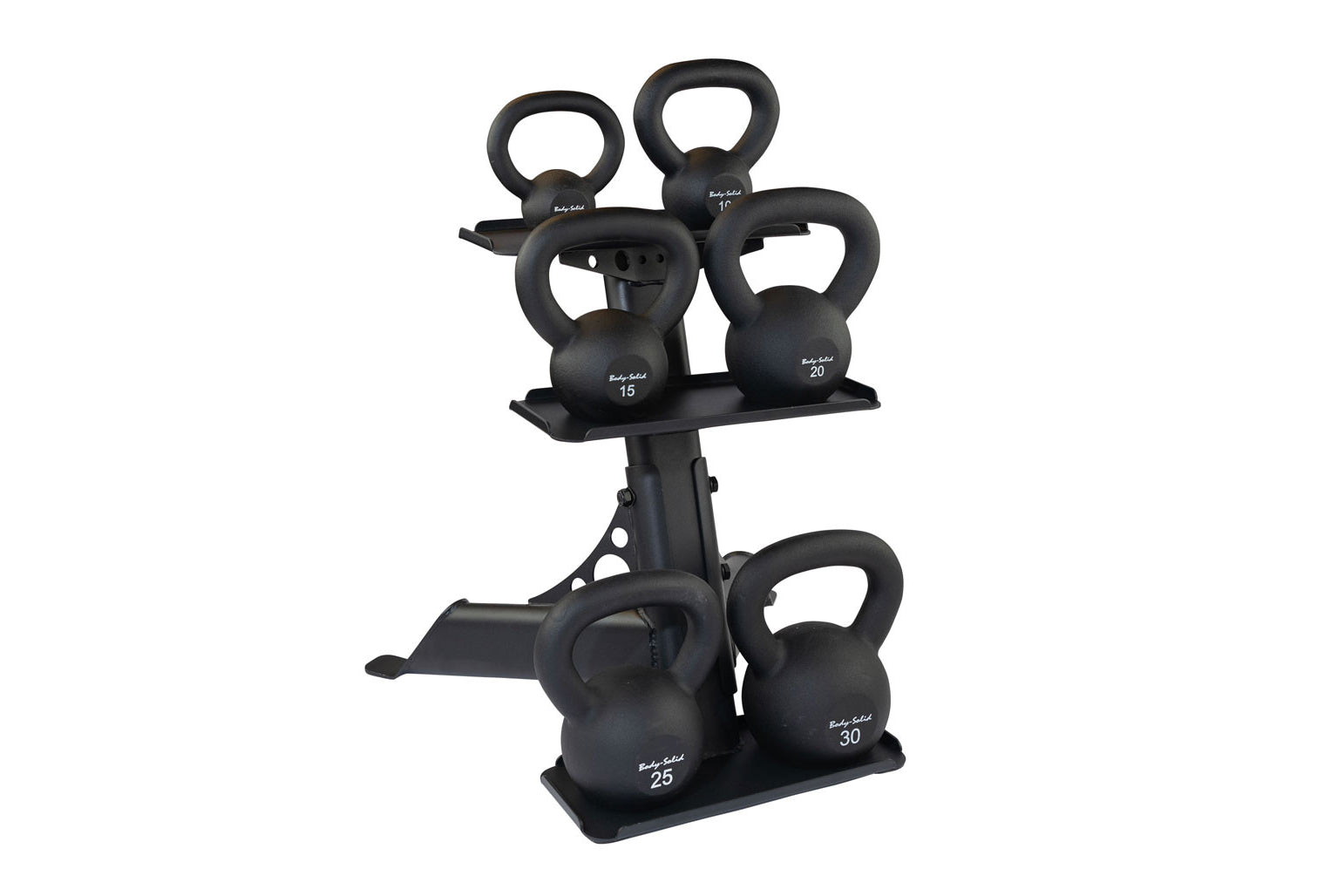 Designed for compact kettlebell storage, the Body-Solid Compact Kettlebell/Dumbbell Rack (GDKR50B) provides storage for 6 total kettlebells. The GDKR50B stores any size kettlebell from up to 50lbs. Three offset shelves provide easy access for all 6 kettlebells. The modern design complements any fitness room. The perfect companion for your Body Solid kettlebells, the GDKR50B is compact, stable and affordable.