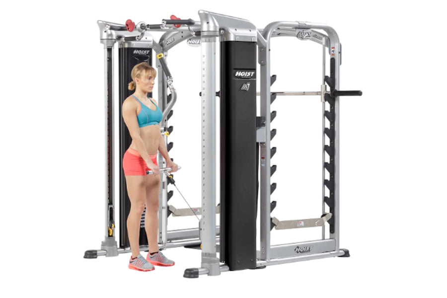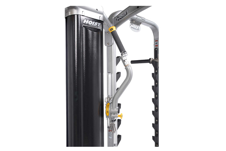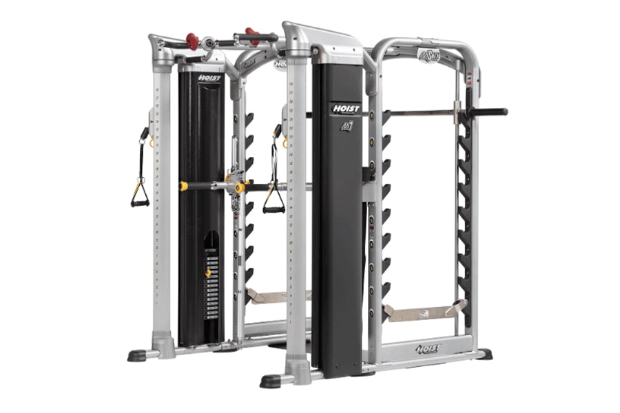 The Mi7Smith Functional Training System is a completely innovative home gym that maximizes space by combining the MiSmith Dual Action Smith with the Mi7 Functional Trainer with a walk-through design to deliver a sleek and efficient gym unlike any other. Now, get ready for the next big innovation in home strength with three new HOIST products from the “Mi Series” of home gyms. On one side of the Mi7Smith, the MiSmith Dual Action Smith features revolutionary patented technology that produces a simultaneous horizontal and vertical bar movement, providing the benefits of free weight training with added safety and stability. Walk through to the other side of the Mi7Smith and the Mi7 Functional Training System features dual Silent Steel® weight stacks with 360 degree rotating columns for completely free range of motion. Patented Flip n Grip® grips offer five pull-up grip options and patent-pending Flip n Dip® grips offer both narrow and wide dips.