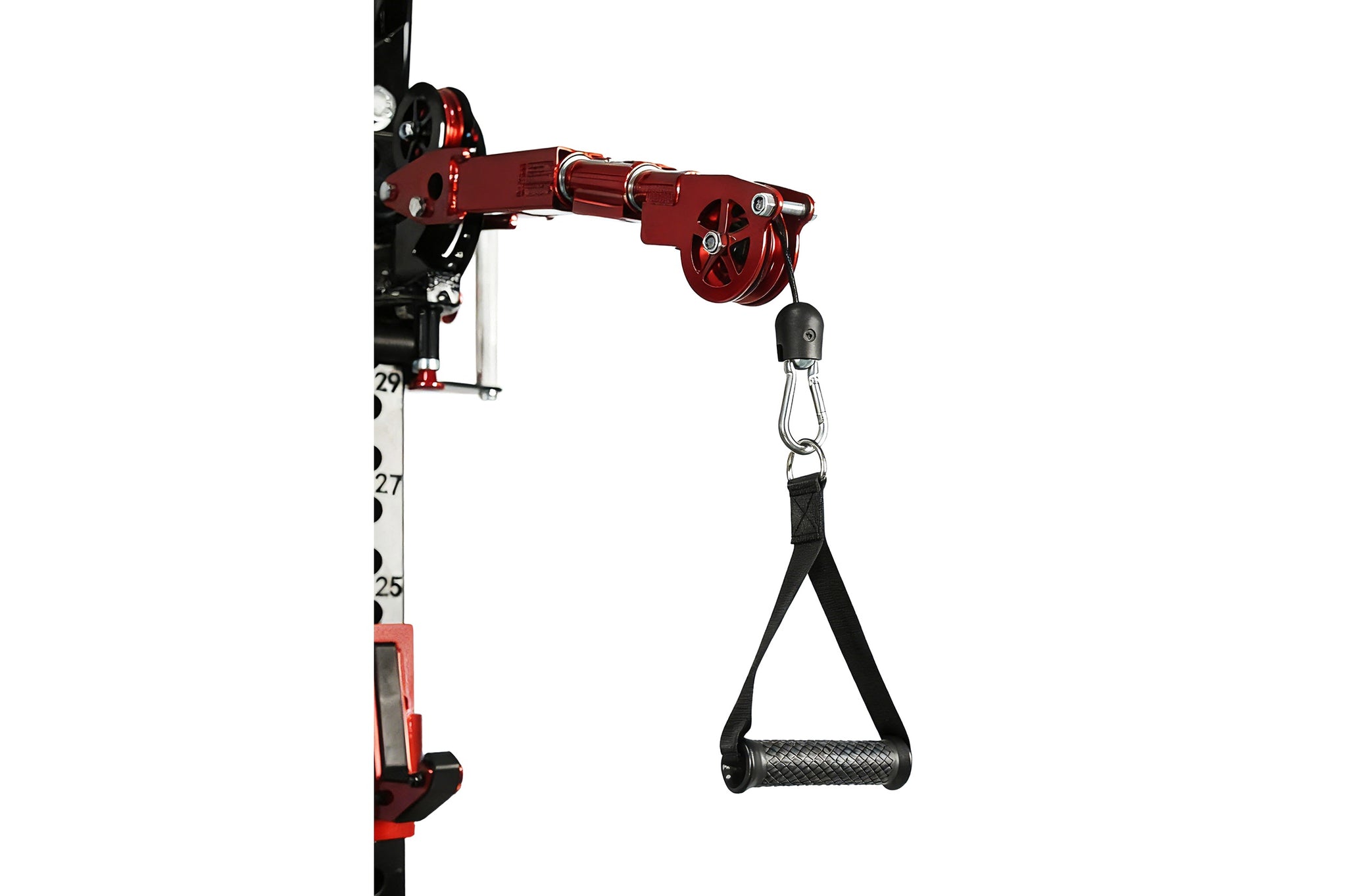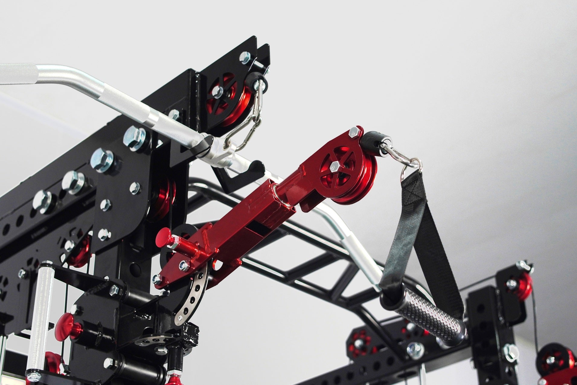 The anodized red aluminum pulley assembly includes an aircraft-grade smooth cables system allowing no jerky movements or catching while using either upper or lower stations.