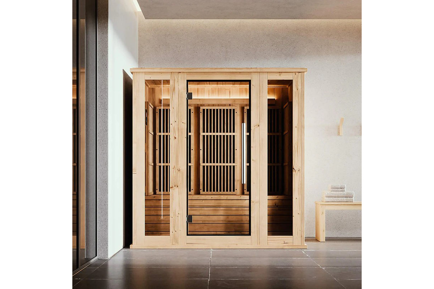 Experience the soothing benefits of far infrared heat in this compact, 2-3 person sauna designed for pure comfort and relaxation. Large windows bring in natural light, creating an open and airy feel, and the upper and lower benches allow you to choose between a warmer or cooler session. It also comes equipped with a smart digital touchpad for easy start/stop control and simple temperature adjustments. Plus, installation is a breeze and integrates seamlessly into your space using your existing flooring.