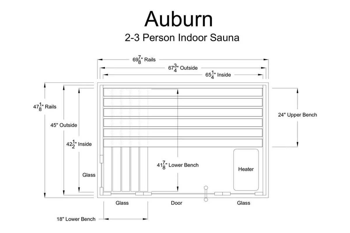 The Auburn sauna comfortably seats 2 to 3 people with a spacious interior measuring 65¼″W x 42½″D x 76⅛″H. It features a full-length upper bench (65¼″W x 24″D) for relaxed, reclined seating and a compact lower bench (18½″W x 18″D) for additional seating or step-up support, all designed to maximize comfort in a compact footprint.
