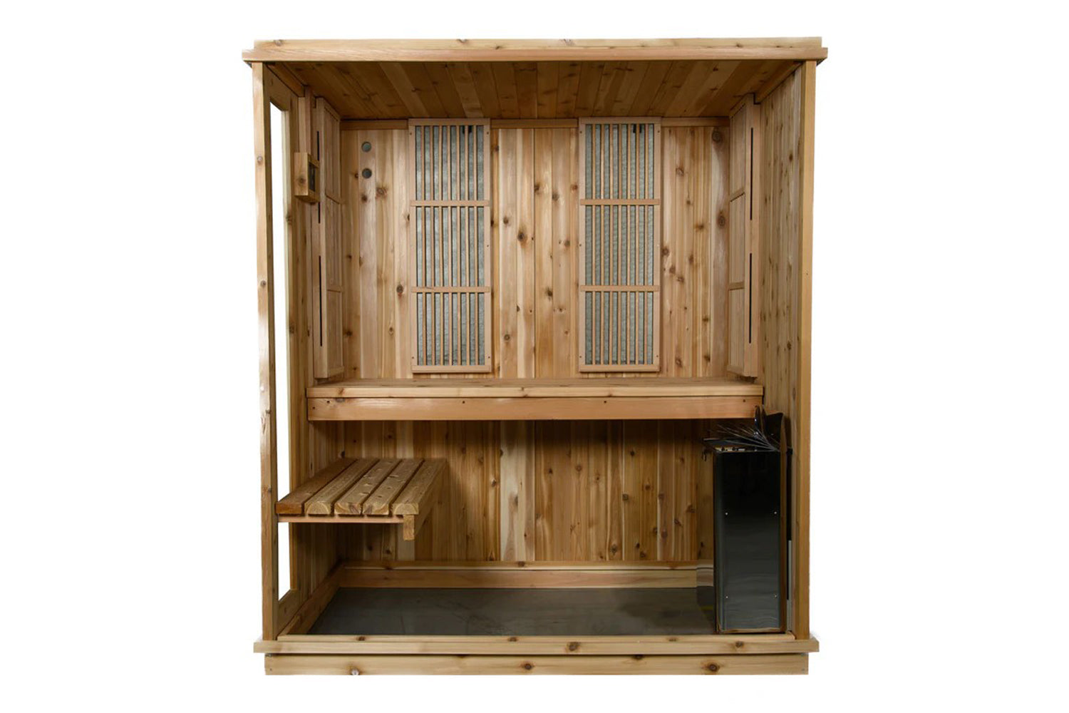Seats three people in a compact design with large windows for an open feel. Choose the top bench for more heat or the lower bench for a cooler experience. The Harvia 6kW heater reaches 180ºF in an hour or can be delayed up to eight hours. It fits seamlessly into your space using existing flooring.