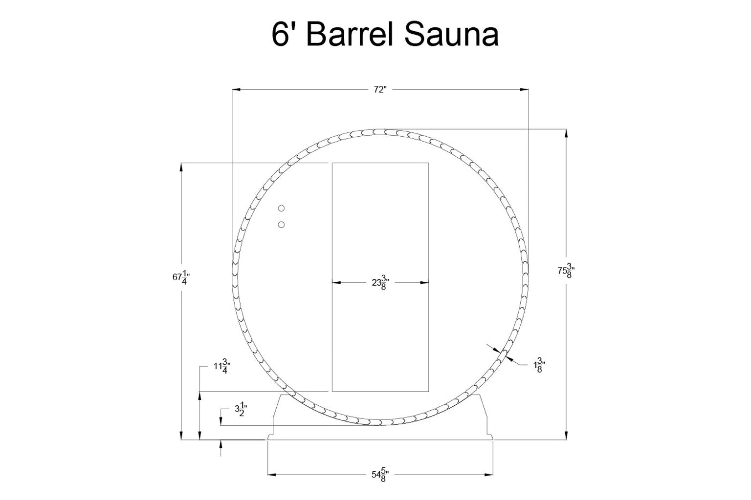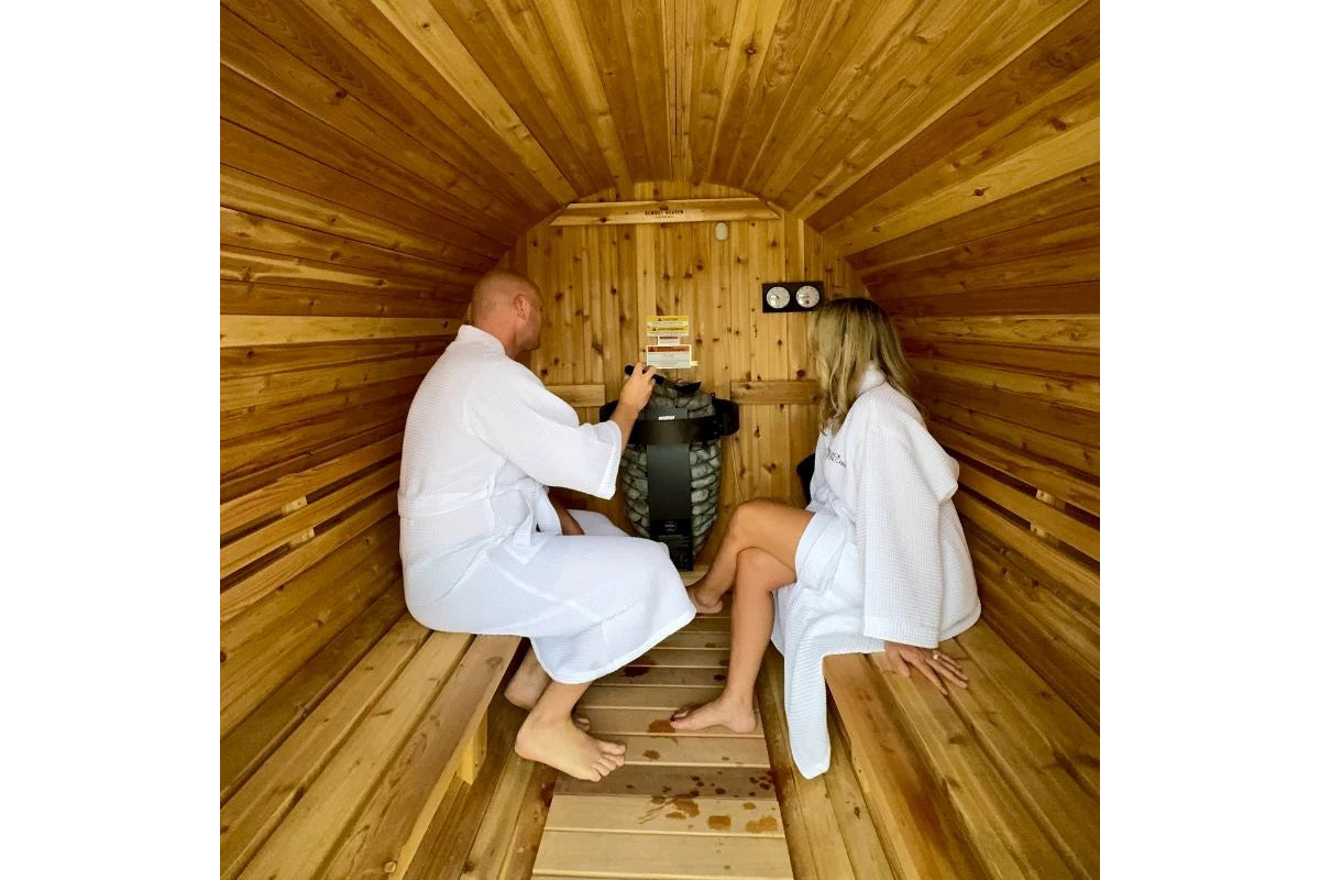 The 6' x 5' Vienna barrel sauna is designed for efficiency, comfortably fitting two people while reaching 180ºF with the Harvia 6kW electric heater. A one-foot canopy extends beyond the door, creating built-in exterior benches (69 ¼″W x 14 ⅝″D x 69 ¼″H) for cooling off or storing essentials. Inside, the 16″W x 39 ¼″L x 17″H benches provide a cozy yet comfortable space to relax.
