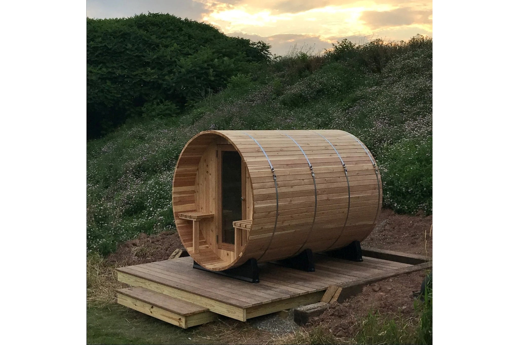 The Barrel Sauna is built with a ball-and-socket profile, secured by stainless steel bands for a tight, reliable seal that adapts as the wood naturally expands and contracts. It sits on durable polymer cradles, keeping it elevated and protected from ground moisture, ensuring longevity and stability.