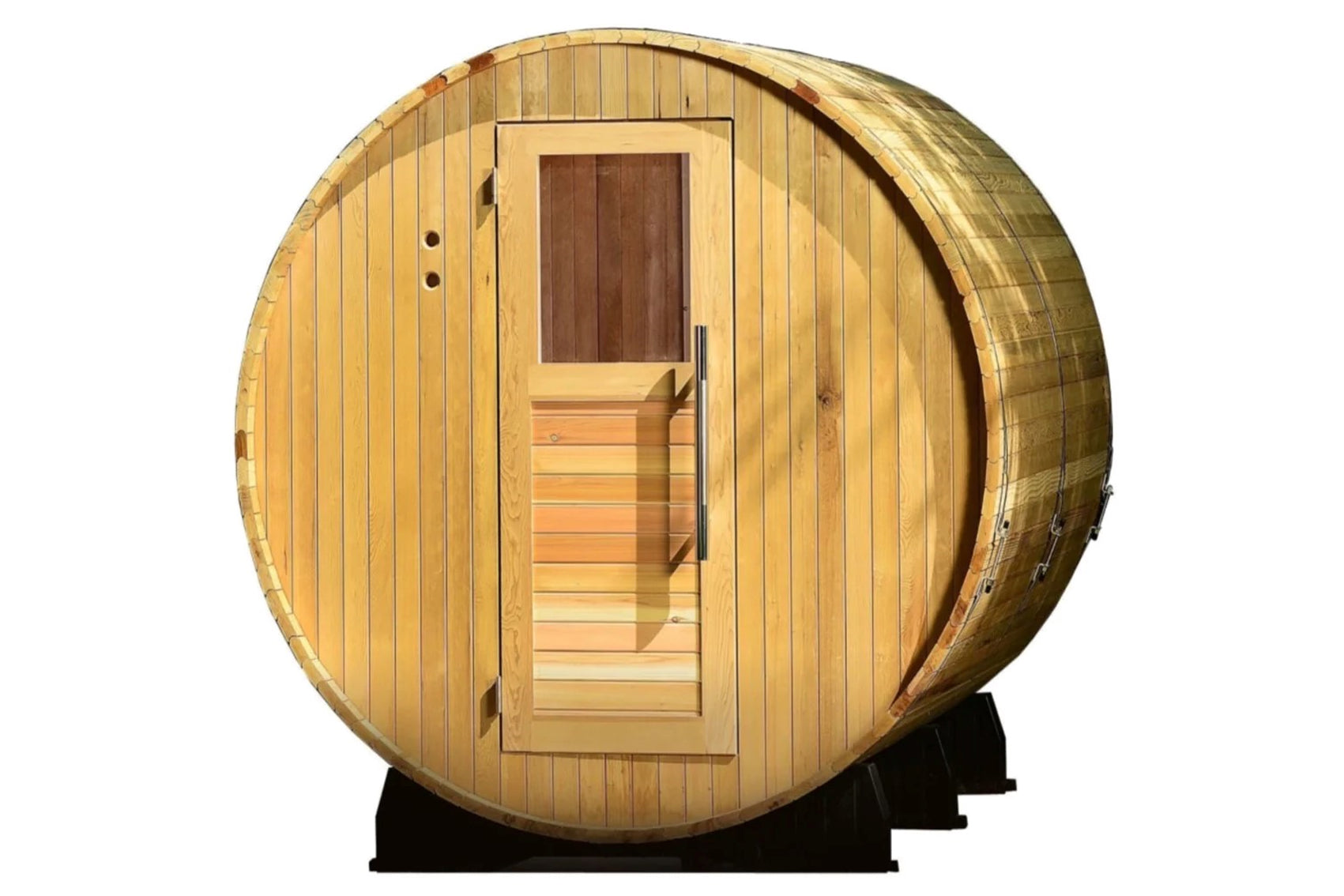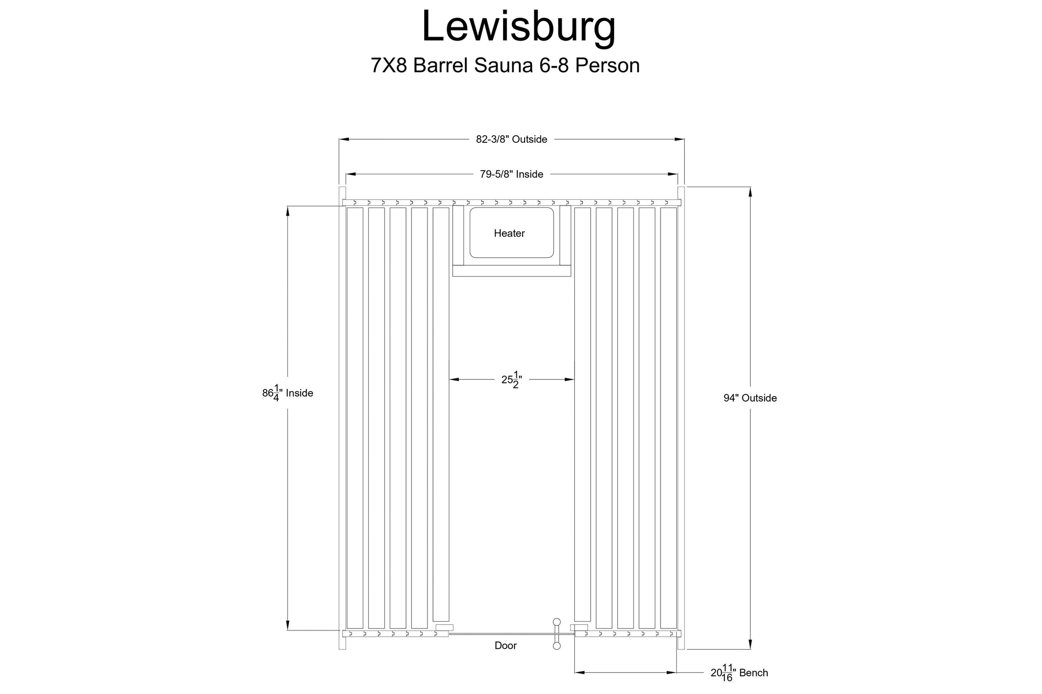 The 7' x 8' Lewisburg Sauna offers extra space to stretch out, with a larger diameter than standard barrel saunas. Choose a wood-burning heater or the Harvia 8kW electric heater, which heats to 180ºF for a steamy, relaxing session.