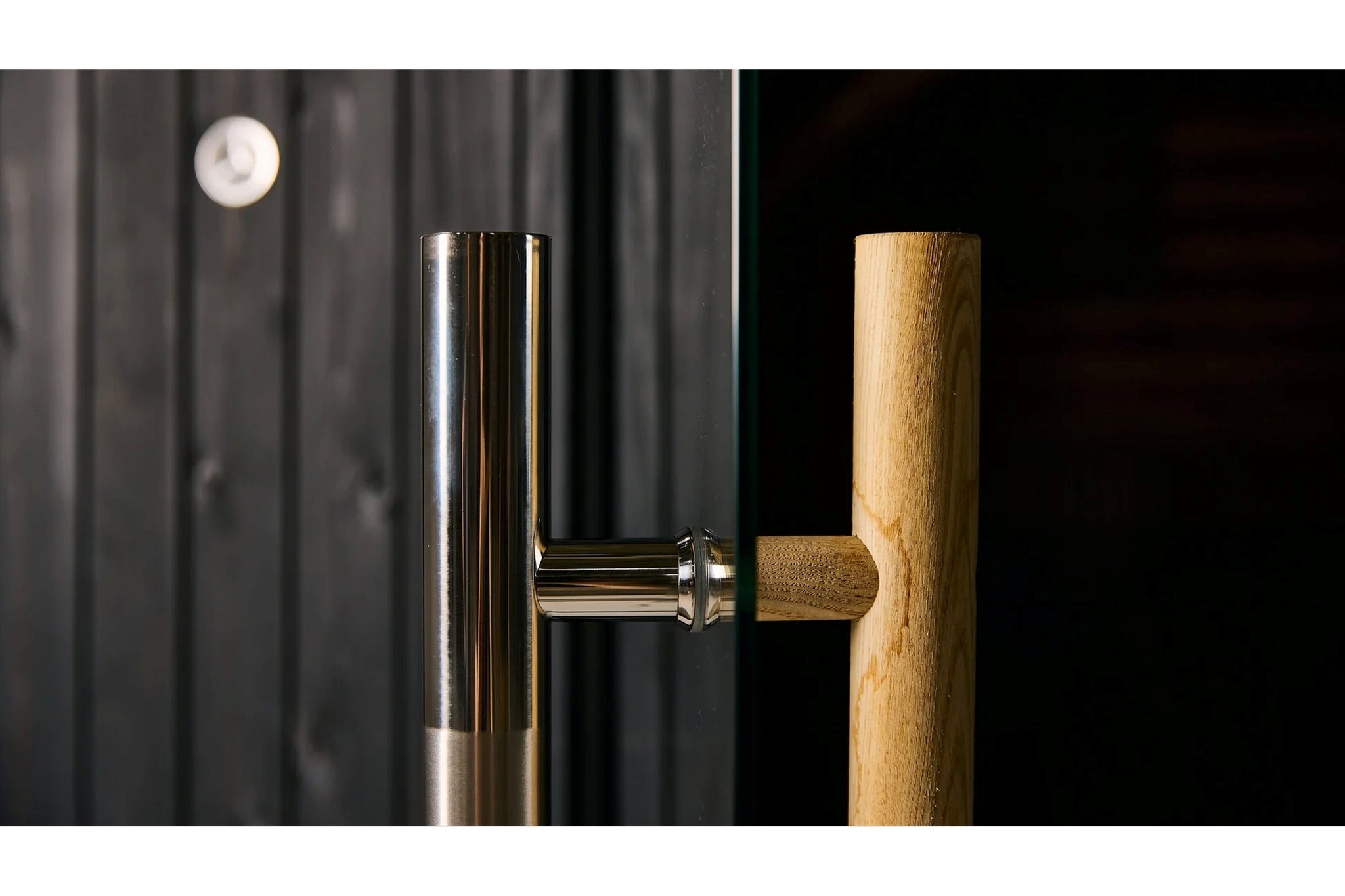 Enhance your sauna experience with a beautifully handcrafted wood door featuring a tempered full or half glass window. Built with thick, insulating lumber of your choice, it lets in natural light and features a large handle—stainless steel on the outside and wood on the inside—for a perfect blend of durability and comfort.