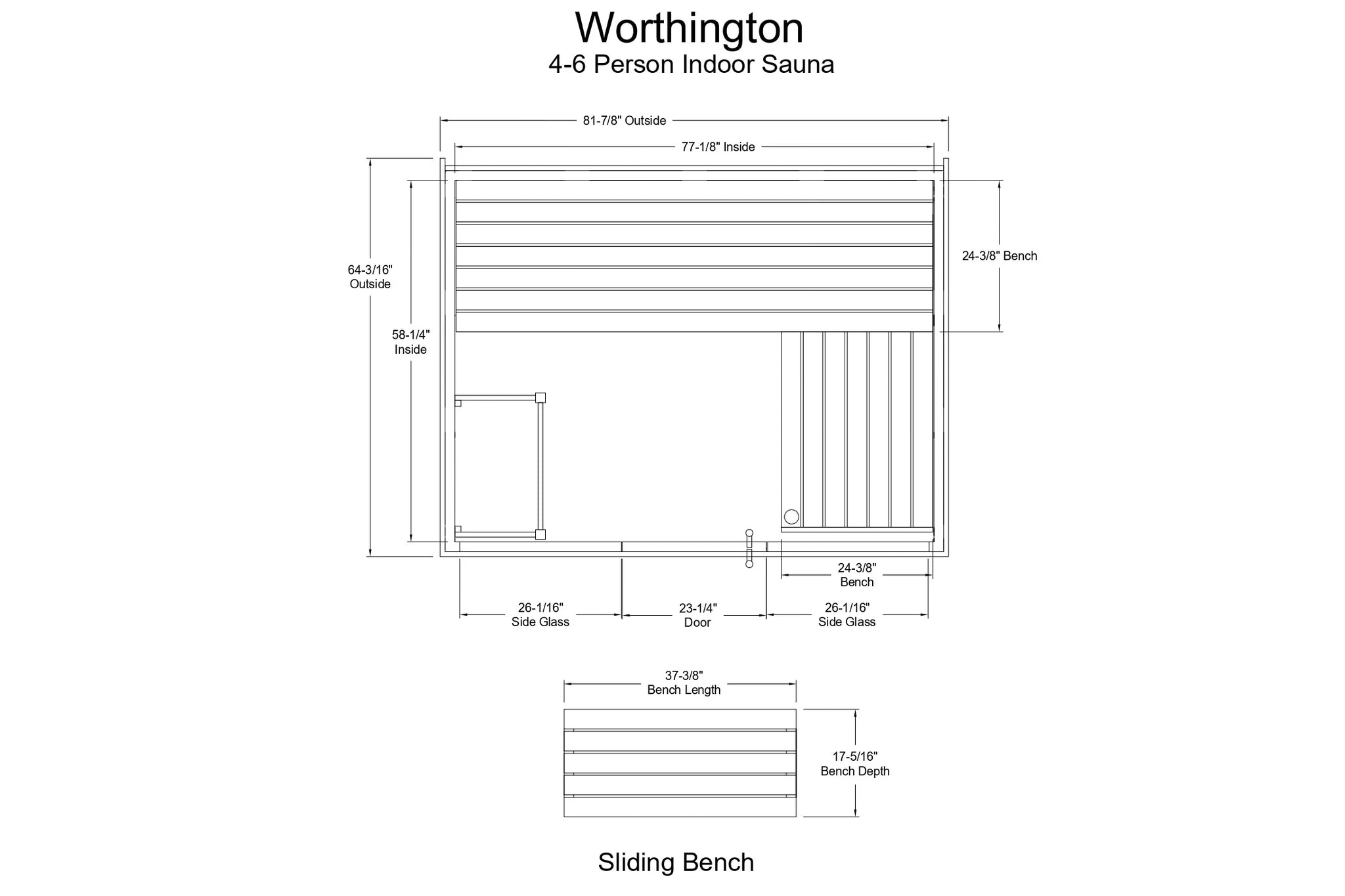 The Worthington sauna comfortably seats up to 6 people, with an interior measuring 77⅛″W x 58¼″D x 78″H. It features a spacious full-length bench (77⅛″W x 58¼″D x 37″H) for relaxed seating, complemented by a sliding lower bench (37⅜″W x 17⅕″D x 17¾″H) that provides added flexibility and easy access—perfect for group wellness sessions. Spacious, Social & Built to Impress