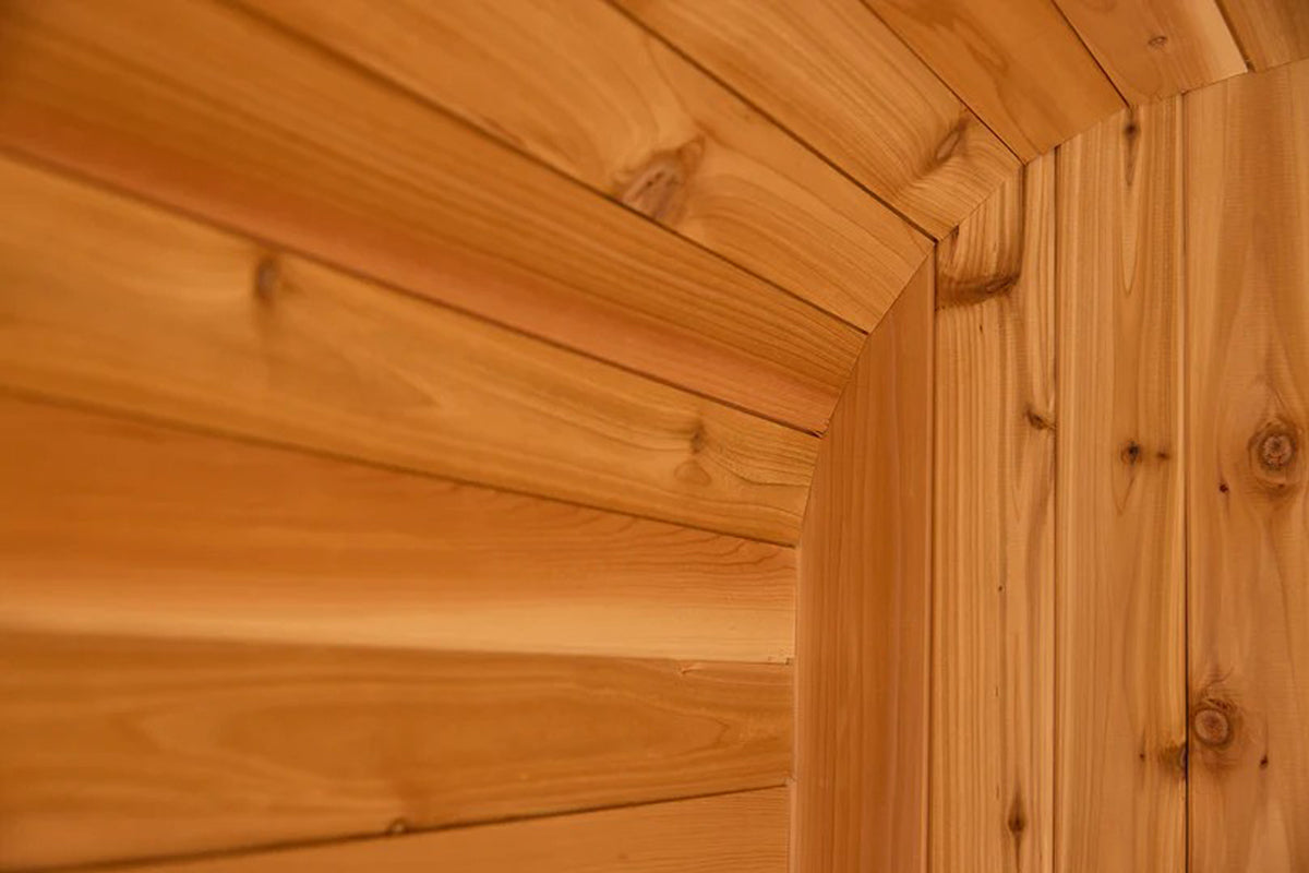 The Barrel Sauna is built with a ball-and-socket profile, secured by stainless steel bands for a tight, reliable seal that adapts as the wood naturally expands and contracts. It sits on durable polymer cradles, keeping it elevated and protected from ground moisture, ensuring longevity and stability.