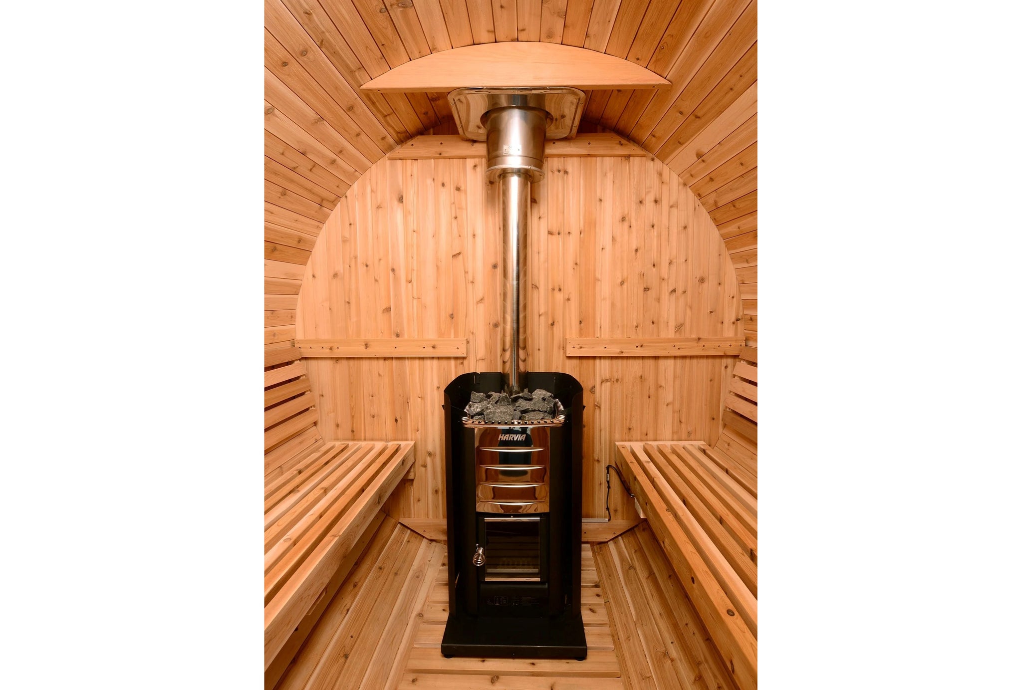 Every sauna comes with a trusted Harvia heater from Finland. Choose electric for convenience or wood-burning (select outdoor models) for a traditional, fire-fueled experience. Both deliver consistent heat and an authentic sauna session.
