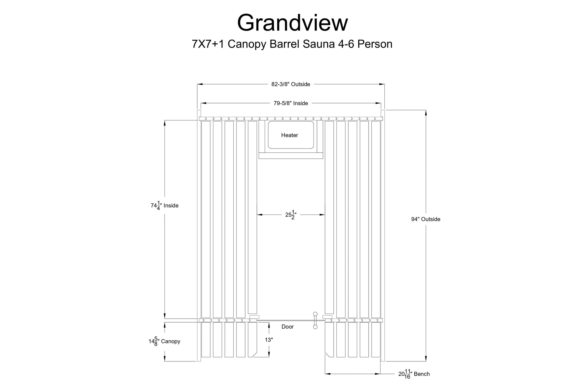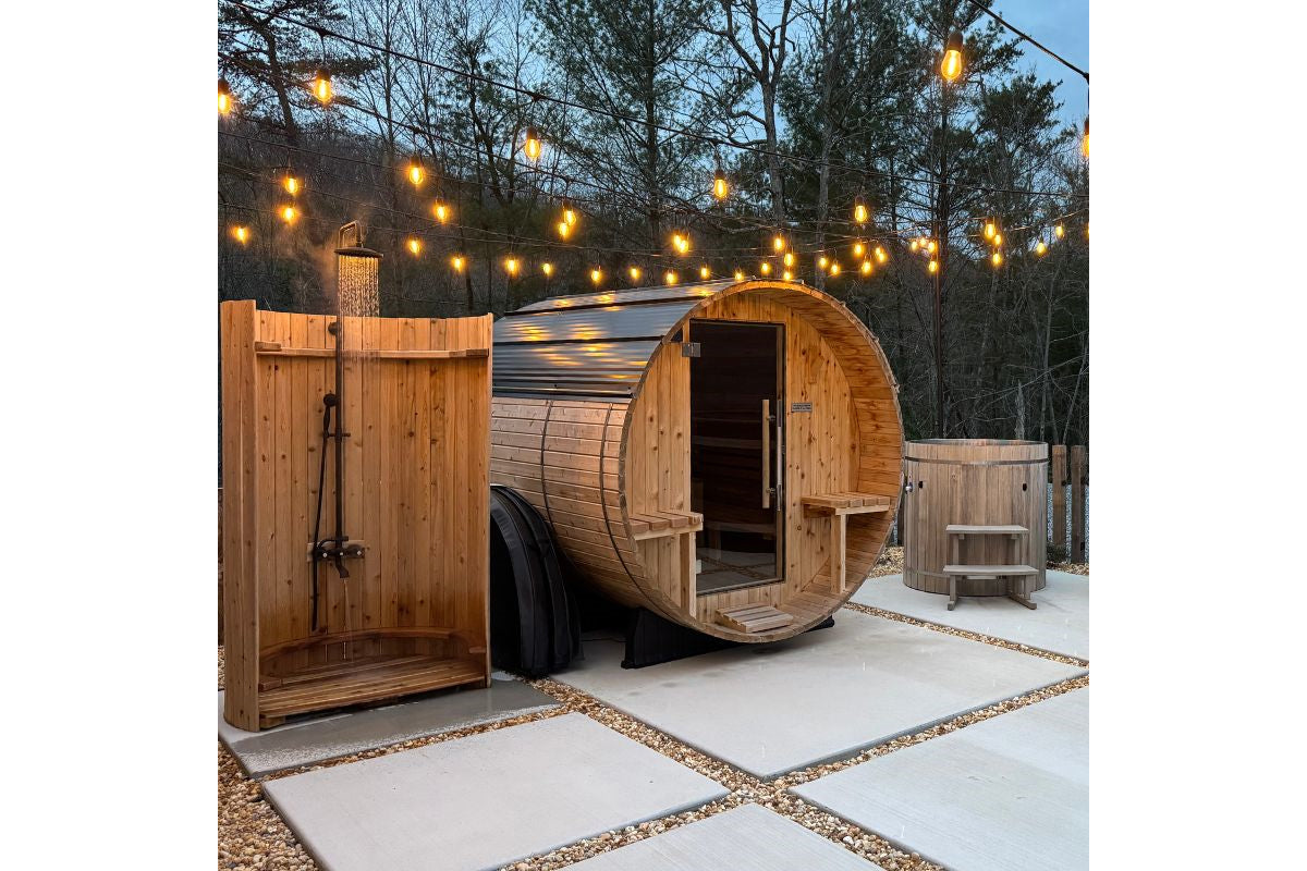 The Almost Heaven Grandview 4-6 Person Canopy Barrel Sauna offers spacious luxury with its 7’x8’ size, accommodating up to six people and featuring an extra foot of width and exterior bench space for added comfort and convenience. Equipped with the powerful Harvia 8kW "The Wall" Heater, it heats rapidly to 175-185ºF within an hour and allows scheduling up to 8 hours in advance. Perfect for both solo relaxation and gatherings, the Grandview's generous size, powerful heating, and versatile design make it an ideal addition to any wellness routine, enhancing comfort and enjoyment. Perfect for gatherings, seating up to six people with a one-foot exterior canopy for cooling off, storing towels, or holding logs. The only canopy barrel model compatible with a wood-burning stove, Virta heater, or Cilindro heater.