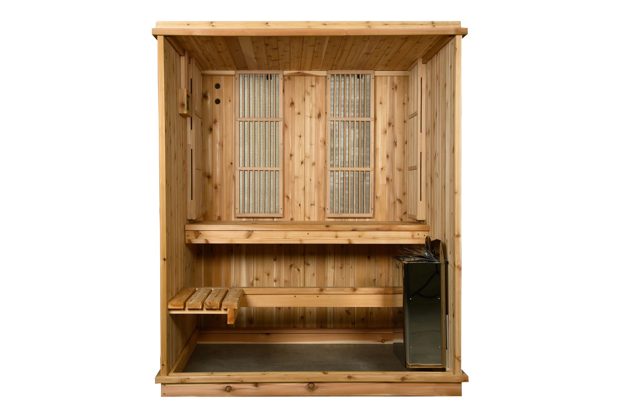 - Two-bench seating: Upper and lower levels for heat variation