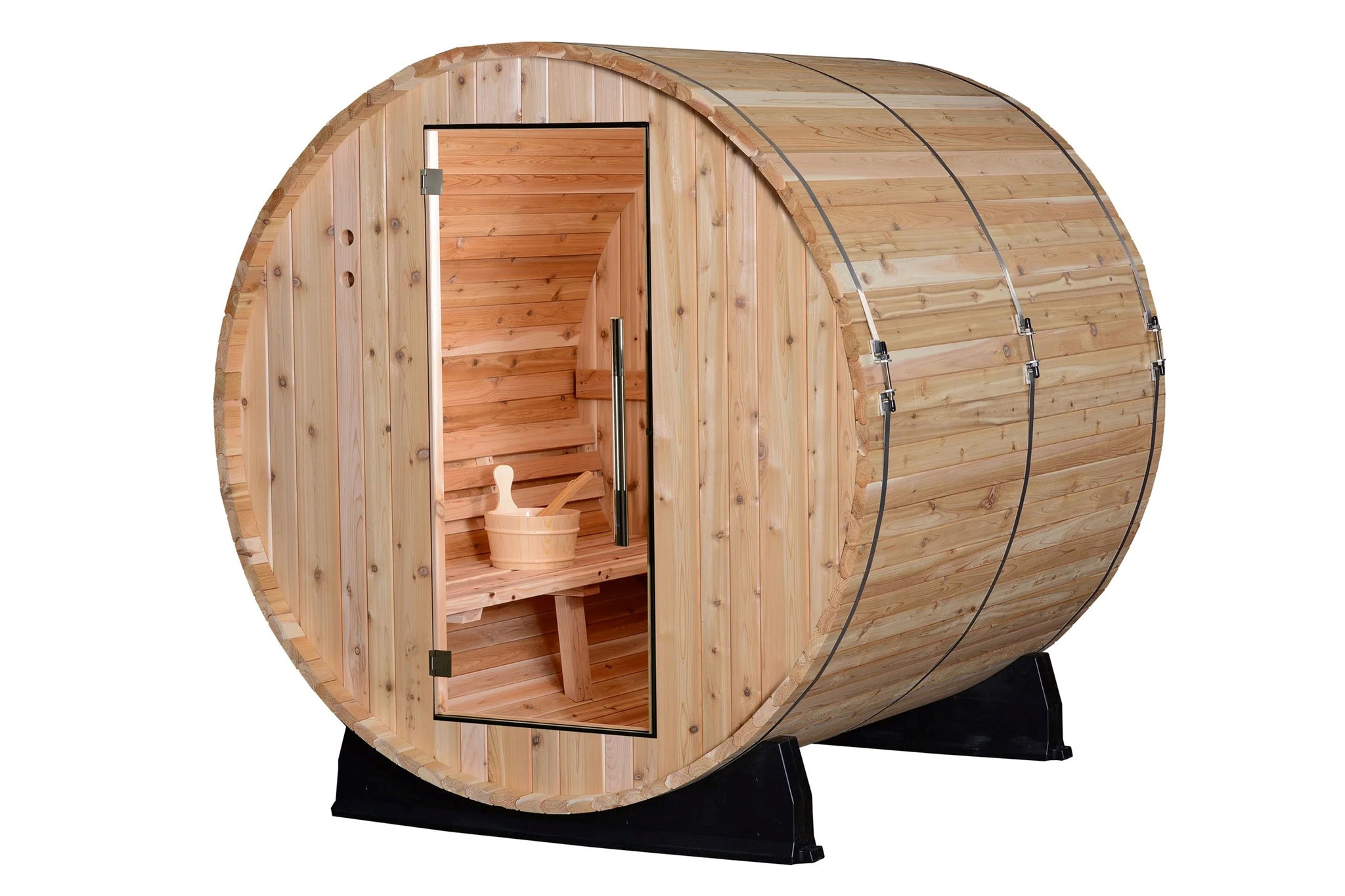 - Door style: Outfit your Pinnacle 4-Person Barrel Sauna with one of the following deluxe door options: full glass door, wood door with a window, or all-wood door.