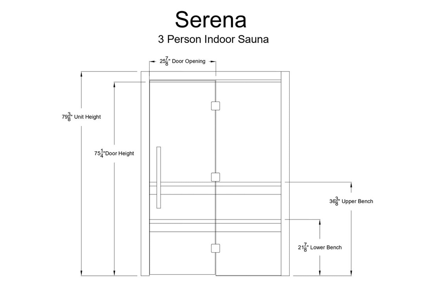 The Serena sauna comfortably seats up to 3 people, with an interior measuring 53¼″W x 60¼″D x 75¼″H. It includes a full-length upper bench (53¼″W x 22½″D) for relaxed seating and a lower bench (53¼″W x 15⅜″D) for added comfort and easy access.