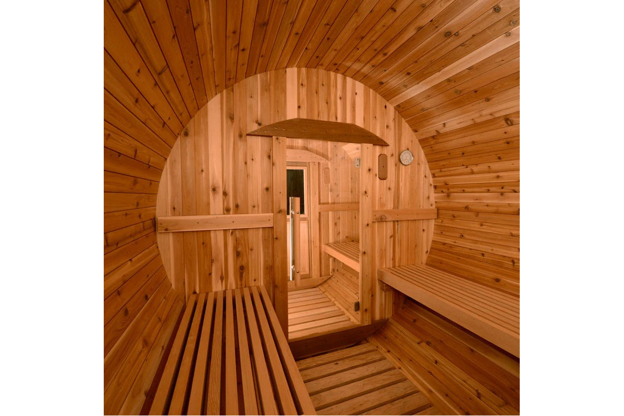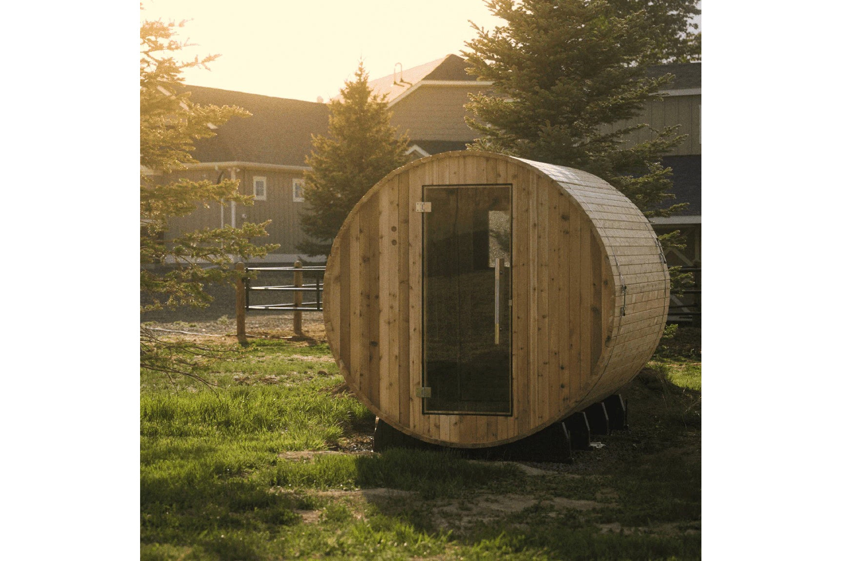 Tailor your sauna’s look and function. Choose the sleek, classic barrel—or add a canopy with built-in exterior benches, perfect for cooling down, storing towels, or keeping water nearby. Either way, it’s built to fit your lifestyle.