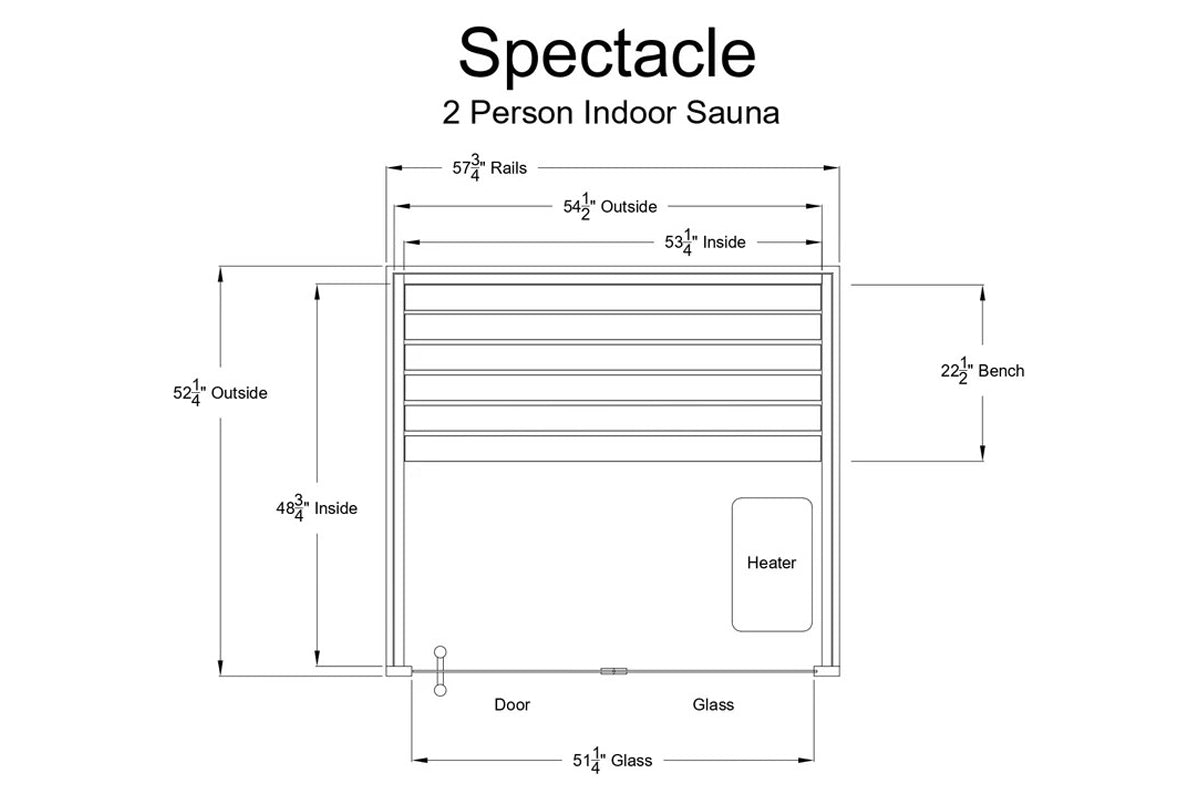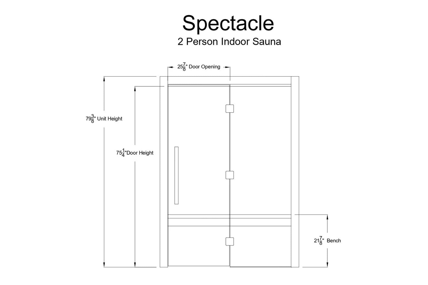 The Spectacle sauna comfortably seats 2 people, with an interior measuring 53¼″W x 48¾″D x 75¼″H. It features a full-length bench (53¼″W x 22½″D) designed for comfortable, compact seating—ideal for personal or paired sessions in a space-efficient layout.
