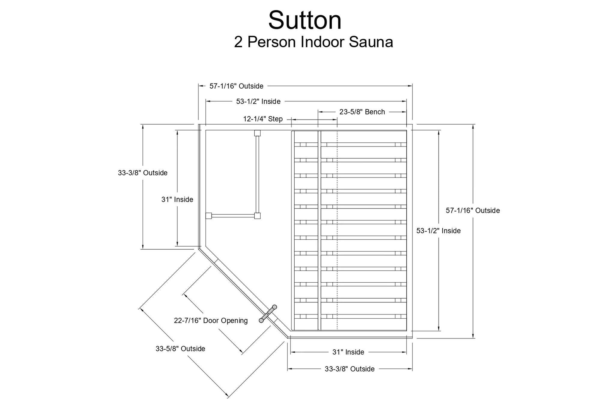 The Sutton sauna comfortably seats up to 2 people, with interior back walls measuring 53½″W x 78″H and side walls at 31″W x 78″H. It features a spacious upper bench (53½″W x 23⅝″D x 36″H) for relaxed seating, paired with a lower bench (53½″W x 12¼″D x 18⅚″H) that adds flexibility and easy access, making it ideal for intimate, personal sauna experiences.