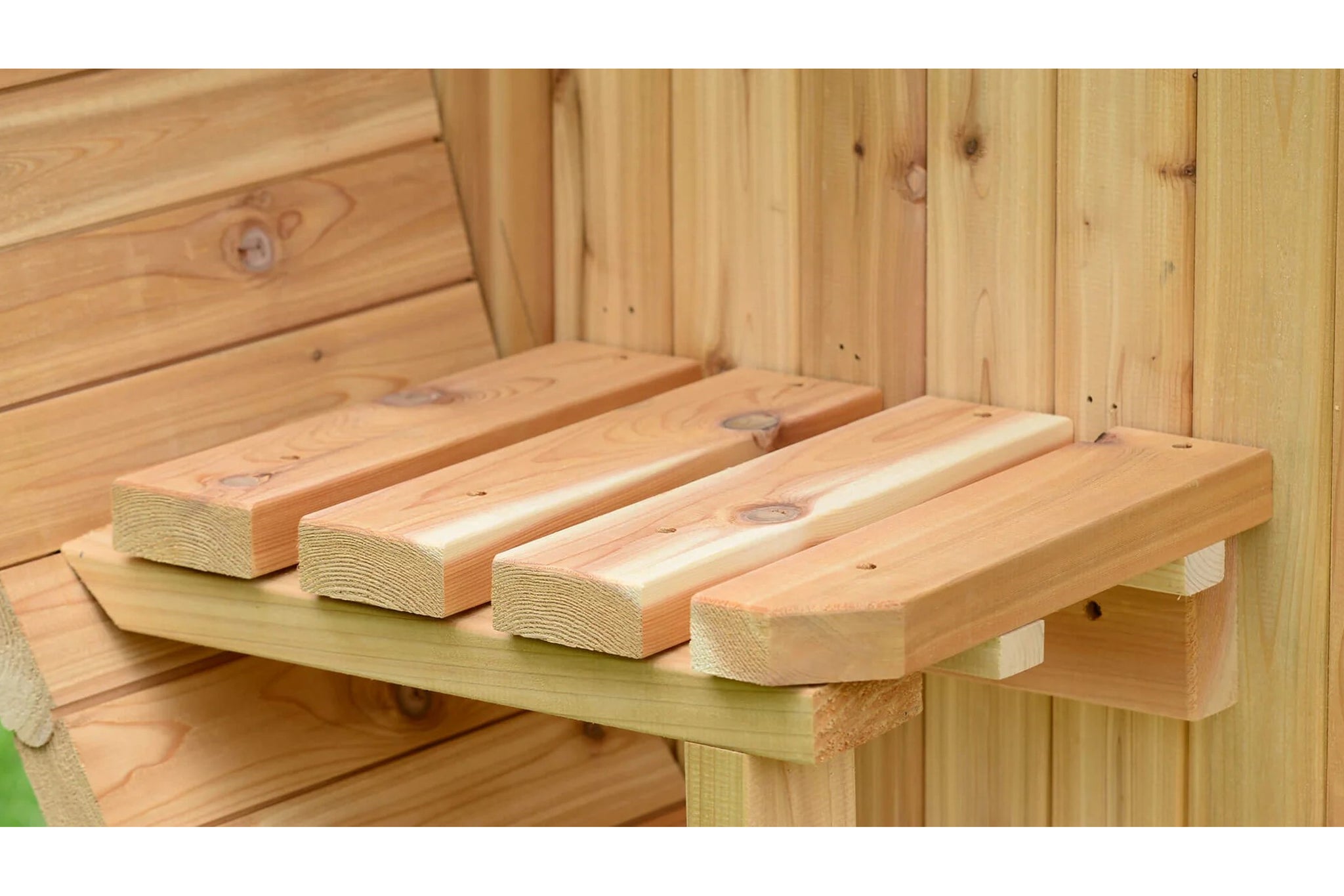 Tailor your sauna’s look and function. Choose the sleek, classic barrel—or add a canopy with built-in exterior benches, perfect for cooling down, storing towels, or keeping water nearby. Either way, it’s built to fit your lifestyle.