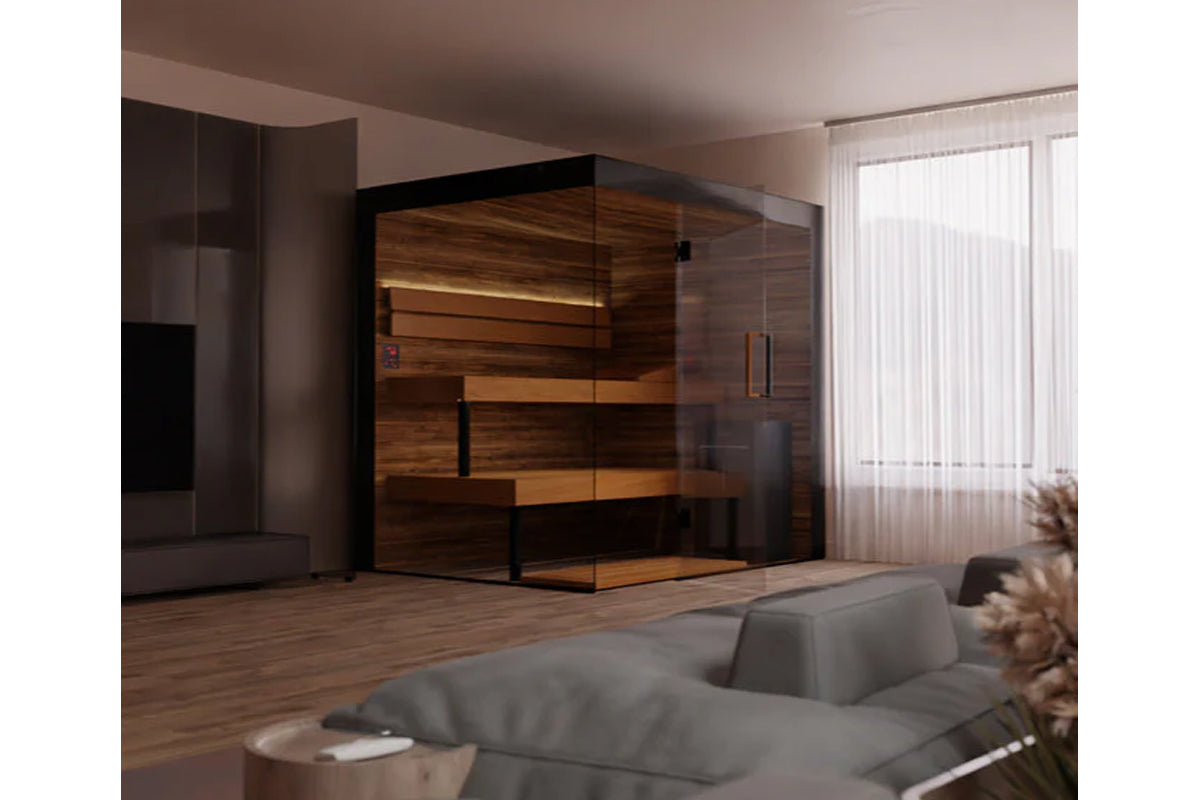 Light-filled and design-forward, Lumaria brings warmth, comfort, and a sense of openness to your home wellness space. Available in two sizes—Medium (2–3 people) and Large (4–5 people)—Lumaria’s corner-friendly layout and panoramic glass front create a spacious, airy feel without compromising on footprint. Inside, thermally modified aspen benches and brushed Tyrol wood walls offer tactile comfort and natural elegance. Integrated LED lighting under the benches and behind the backrests adds customizable ambiance, all controlled via remote. Multi-layer wall construction and natural wood fiber insulation ensure lasting performance and energy efficiency.