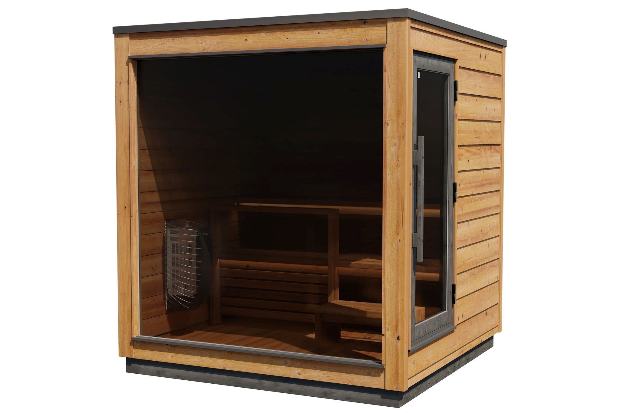 The Thermasol Nordic Dawn Outdoor Sauna Timeless Finnish craftsmanship meets modern design in the Nordic Dawn—a fully assembled outdoor sauna for 4–5 people. Its expansive front window brings nature in, creating a calming space to unwind and reset. Inside, heat-treated wood and ambient lighting set the tone for full-body relaxation in a compact yet open-feeling layout.