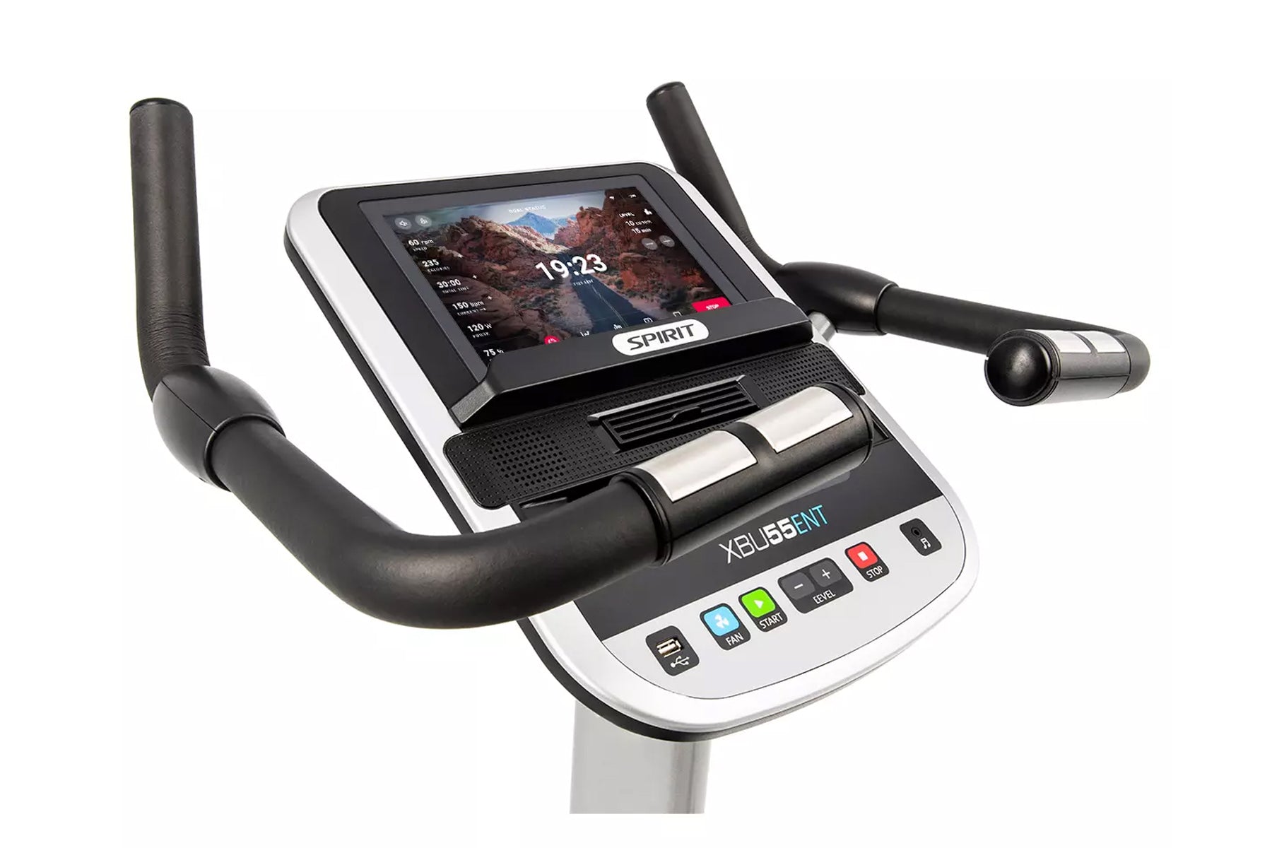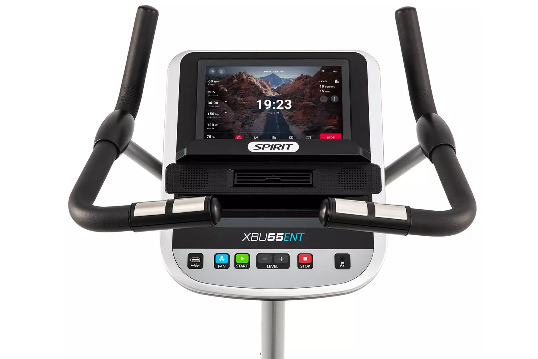 The Spirit Fitness XBU55ENT Upright Bike combines the features of the XBU55 Upright Bike with an advanced ENT console to provide an impressive user experience. With a large 10.1” touchscreen display you can easily navigate through 8 preset and 12 custom programs. Enjoy preloaded apps like Netflix, YouTube, CNN, and more, as well as built-in screen mirroring capabilities and a USB charging port for endless entertainment and motivation so you don’t miss a beat. Built-in Bluetooth FTMS lets you connect to your headphones or an external heart rate monitor. The XBU55ENT was built to last with a 30 lb flywheel and 20 levels of calorie-burning resistance. Durable, comfortable, and smooth are all qualities of the XBU55ENT Upright Bike. Easy adjustments, cooling fan, high density foam seat, challenging programs, and an exceptional entertainment experience are all standard.